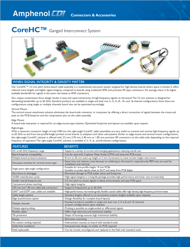 CoreHC™ is a high-performance, solderless ganged coaxial solution designed for direct PCB attachment. Featuring a 2.5mm pitch signal-to-signal configuration, it enables engineers to maximize space savings while reducing PCB size and cost. The DC-70GHz connector minimizes trace lengths, optimizing insertion loss and ensuring superior performance. Available in vertical mount, edge mount (blind mate to CoreHC assembly), and right-angle configurations, CoreHC supports a broad performance range for both RF and Digital Applications.