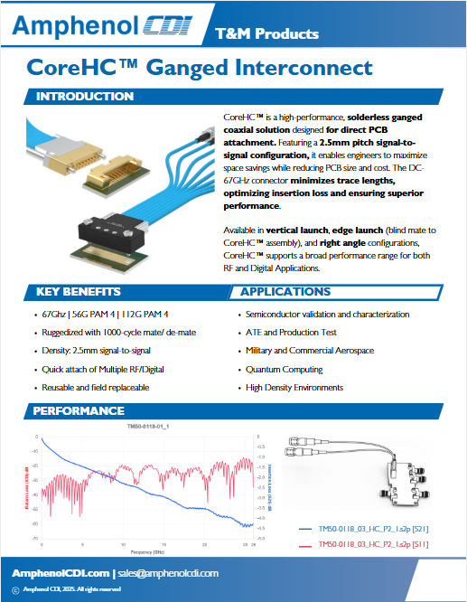 CoreHC™ is a high-performance, solderless ganged coaxial solution designed for direct PCB attachment. Featuring a 2.5mm pitch signal-to-signal configuration, it enables engineers to maximize space savings while reducing PCB size and cost. The DC-70GHz connector minimizes trace lengths, optimizing insertion loss and ensuring superior performance. Available in vertical mount, edge mount (blind mate to CoreHC assembly), and right-angle configurations, CoreHC supports a broad performance range for both RF and Digital Applications.
